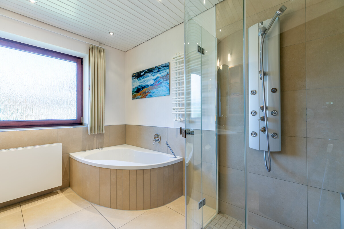 Eine Wohlfühlkur für die Sinne ist das modernisierte Vollbad mit bodentiefer Dusche und Eckbadewanne. Wer die nötige Entspannung wünscht und seinem Körper etwas Gutes tun will, wird hiervon begeistert sein. Mit seinen hellen Farbtönen und Transparenz aus Glas wirkt dieser Raum stylisch & modern.