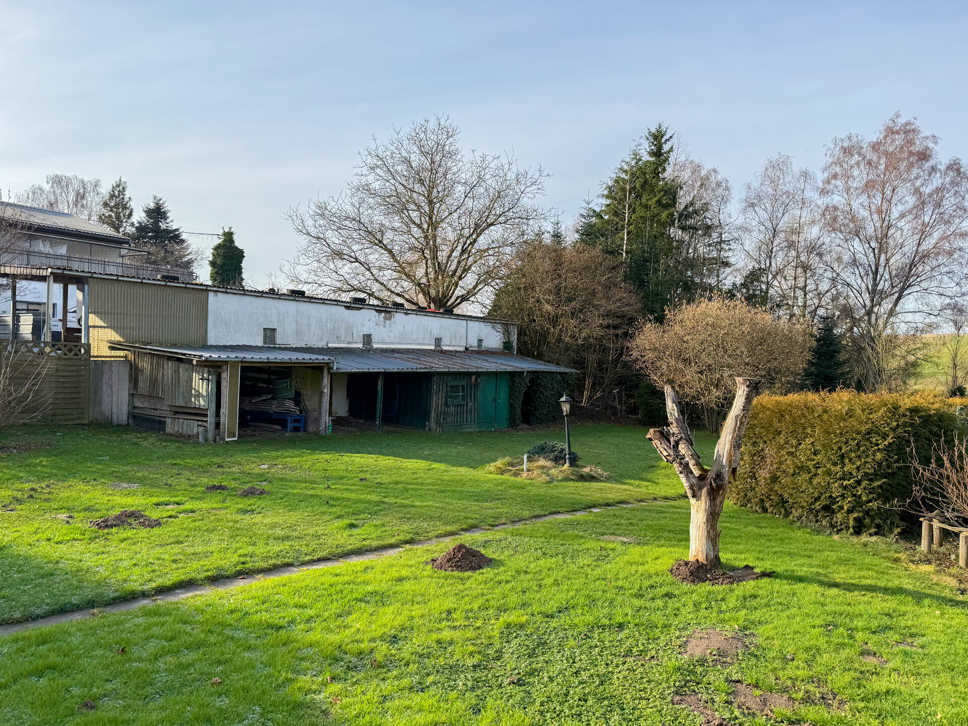 Auf dem großzügigen Grundstück von ca. 1.124 m² befinden sich zwei Einfamilienhäuser mit äußerst vielseitigen Nutzungsmöglichkeiten. Ob Wohnen & Arbeiten, Mehrgenerationenwohnen, Teilvermietung oder Kapitalanlage – nahezu alle Nutzungskonzepte sind denkbar. Besonders hervorzuheben ist der große Garten, der nach hinten an den Ortsrand grenzt. Das Vorderhaus (Haus 1) aus schätzungsweise 1900/10 verfügt über rund 130 m² Wohnfläche, ist voll unterkellert und das Dachgeschoss ist ausgebaut. Durch den vorhandenen Vorder- und Hintereingang sowie den Grundriss ist eine Aufteilung in zwei Einheiten möglich; zwei separate Stromzähler sind bereits vorhanden. Die ehem. Scheune (heute Haus 2), wurde 1991 zum heutigen Wohnhaus umgebaut, liegt in zweiter Baureihe und grenzt direkt an das Gartengrundstück. Im Erdgeschoss befinden sich Heizung, Garage sowie ein verglaster Sitzbereich mit Sommerküche. Die Wohnräume liegen im Obergeschoss. Der Speicher bietet zusätzliches Ausbaupotenzial. Das Grundstück überzeugt mit zahlreichen Sitzplätzen, zwei Gewächshäusern, Beeten, Pool mit Filteranlage, Regenwassertanks, Teich sowie mehreren Schuppen- und Werkstattbereichen und bietet insgesamt viel Platz für unterschiedlichste Bedürfnisse.